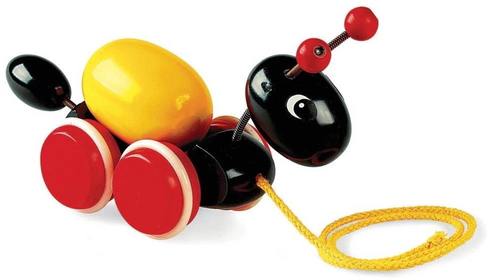 Dieser fleißige Freund trägt ein Ei auf seinem Rücken. Wenn man an der Schnur zieht, dreht sich das Ei auf dem Rücken herum.