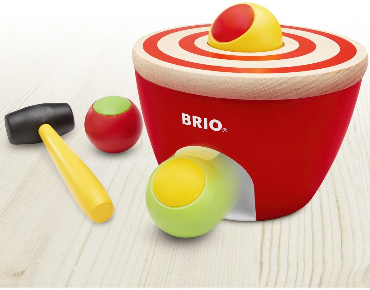 Das wird dich begeistern! Hämmer die verschiedenfarbigen Kugeln in den Behälter und höre und sieh, wie sie durch die drei Öffnungen herausrollen. Fang sie auf! Und dann noch mal von vorne, und noch einmal!