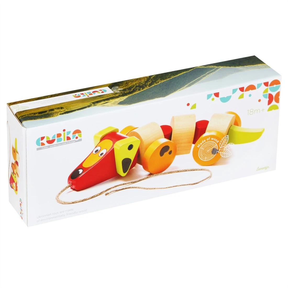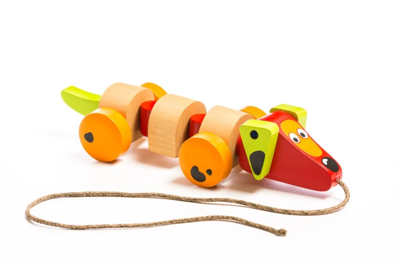 Dieser farbenfrohe Dackel aus Holz folgt dir auf deinen Entdeckungsreisen. Die Ziehfigur stimuliert die Entwicklung von Koordination, Gleichgewicht und Muskelkraft. Geeignet für Kinder ab 18 Monaten. Abmessungen: 4,5cm x 7 cm x 22 cm.