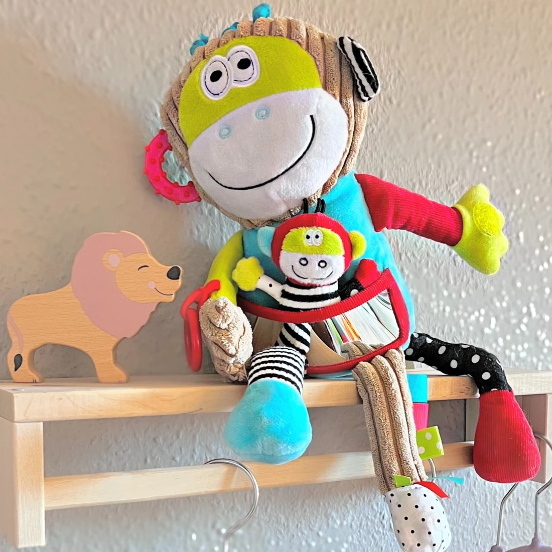 Dieser süße Affe mit Mutter und Baby wird für stundenlangen Spaß sorgen. Sie sind nicht nur zum Kuscheln geeignet, sondern bieten auch allerlei Aktivitäten. Das Affenbaby ist eine Rassel und wird in der Tasche seiner Mutter Charlie versteckt, die einen Spiegel enthält. Auf Mamas rechtem Ohr kann man herumkauen und wenn sich ihr Schwanz bewegt, ertönt ein Glöckchen. Alle Sinne werden durch die Beißringe, die Geräusche und den Stoff mit verschiedenen Farben und Texturen stimuliert. Größe: 25 x 13 x 23 cm (L x B x H). Geeignet von Geburt an.