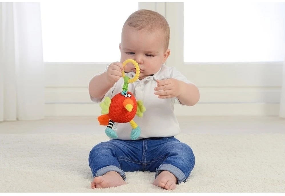Dieser Babypapagei enthält ein schlurfendes Ei, das ein Geräusch macht und einen Rhythmus erzeugt, wenn Ihr Baby damit spielt. An der Oberseite befindet sich ein Beißring mit einer Öffnung, mit der Petra der Papagei am Kinderwagen oder Laufstall aufgehängt werden kann. Der Papagei besteht aus Stoffen mit verschiedenen Texturen. Abmessungen: 19 x 14 x 8 cm (L x B x H). Geeignet von Geburt an.