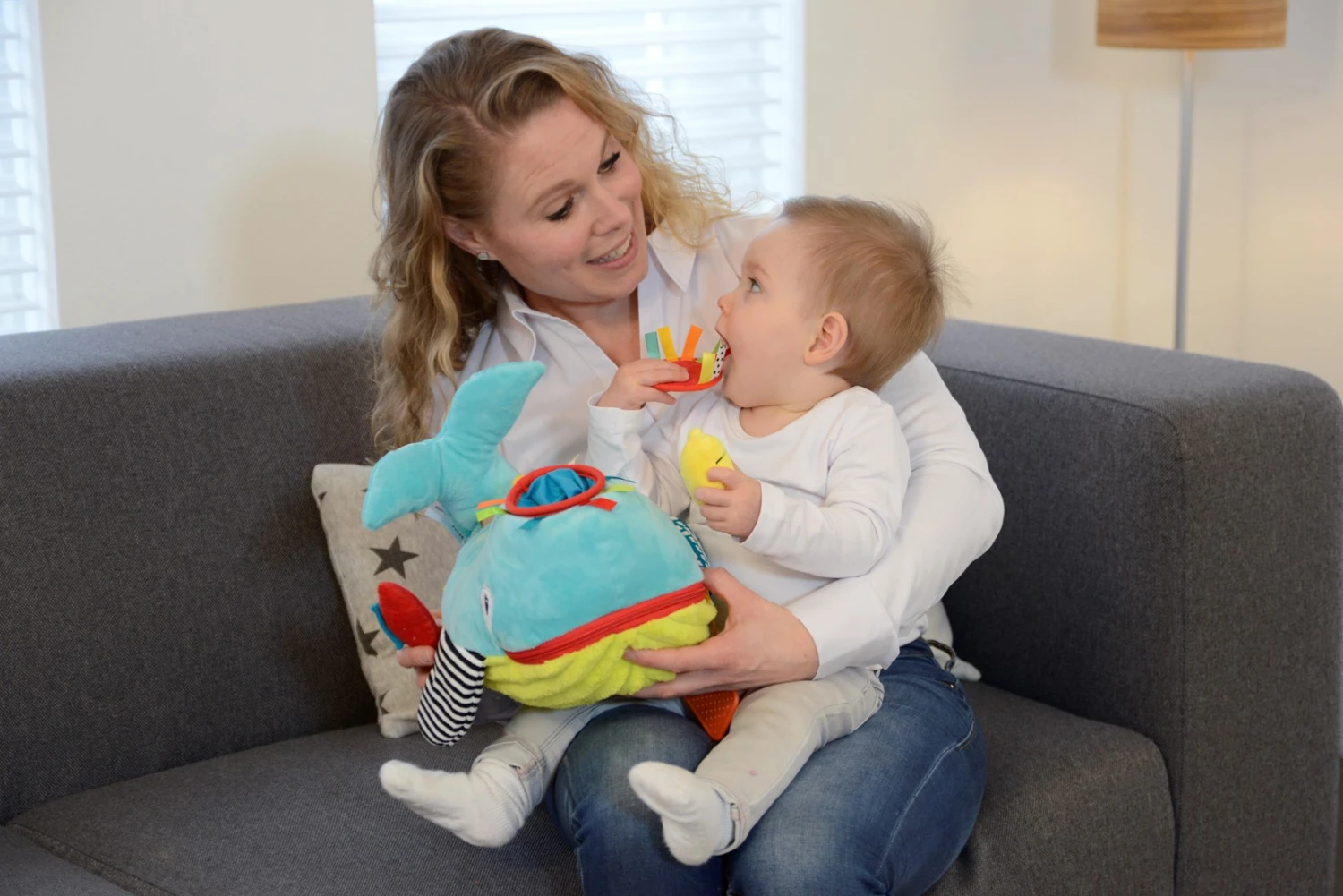 Dieser fröhliche Wal hat ein Blasloch auf dem Kopf, in das man die drei kleinen Meeresbewohner stecken kann. Das Maul von Wallie dem Wal öffnet und schließt sich mit einem Reißverschluss, und die kleinen Meeresbewohner können auch in das Maul des Wals gehen! Entdecke alle möglichen lustigen Aktivitäten mit dem Wal und seinen Freunden. Der Schwanz des Wals quietscht, wenn man ihn zusammendrückt, seine Flosse knistert und der Stoff hat verschiedene Texturen. Der Schwanz des kleinen Fisches ist ein Beißring, der Oktopus hat bunte Etiketten und die Muschel quietscht. Maße 19 x 29 x 21 cm (L x B x H). Geeignet von Geburt an.