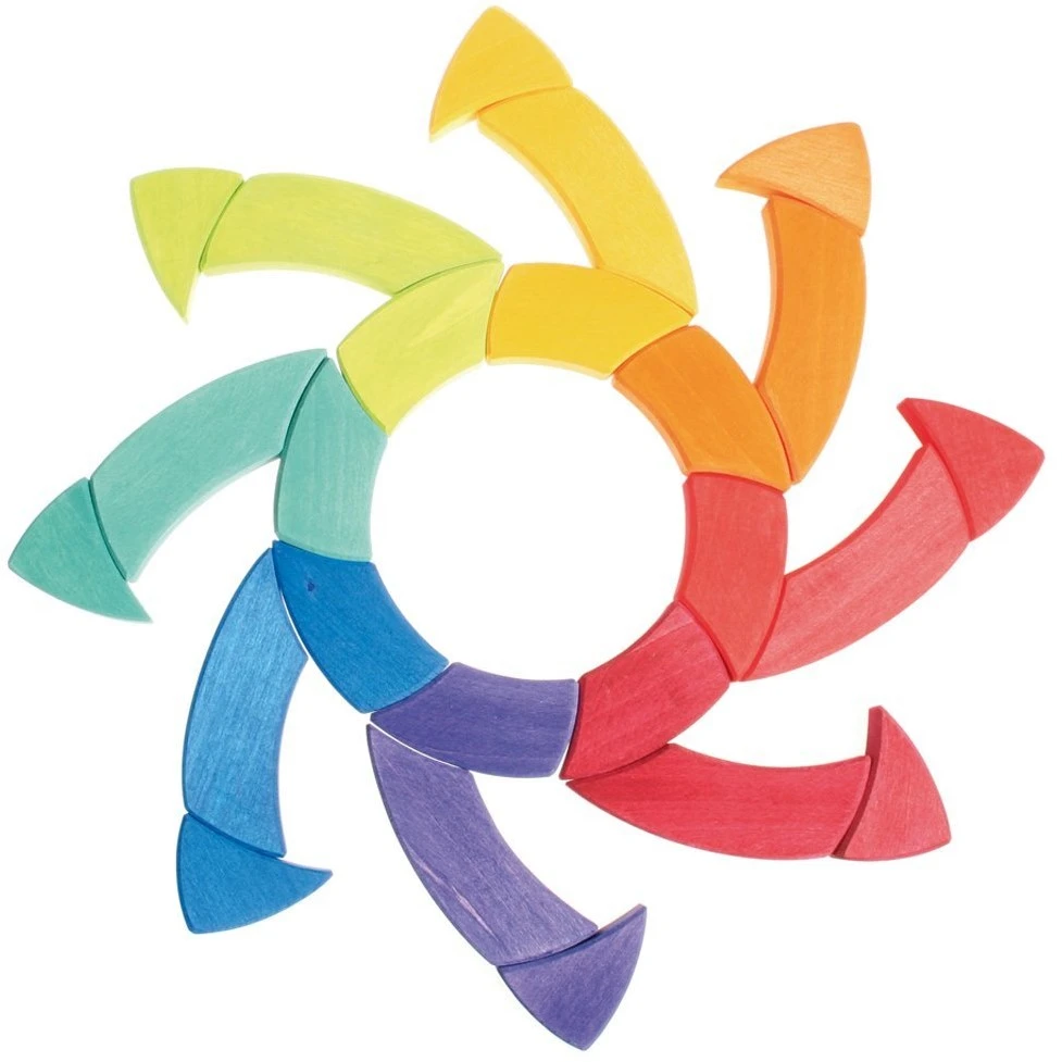 Die Kinder lernen das Verhältnis der Farben untereinander, in dem sie einfach die Teile mischen und danach die Komplementärfarben gegenüber legen, oder die Mischfarben und reinen Farben nebeneinander legen und so den Kreis selbst schließen. Davor sollten die Kinder z.B. beim Mischen von Wasserfarben erleben wie aus Rot und Blau Lila wird.