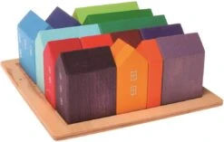 Für kleine Stadtplaner: Schnell entstehen Städte mit moderner Architektur oder Dörfer mit Scheunen und Kirchen, die auch als farbenfrohe Landschaft jede Holzeisenbahn schmücken. Die kleinen Häuser sind durch die einfache Form leicht zu stapeln. Schnell ist ein hoher Turm oder eine kleine Stadt aufgebaut.