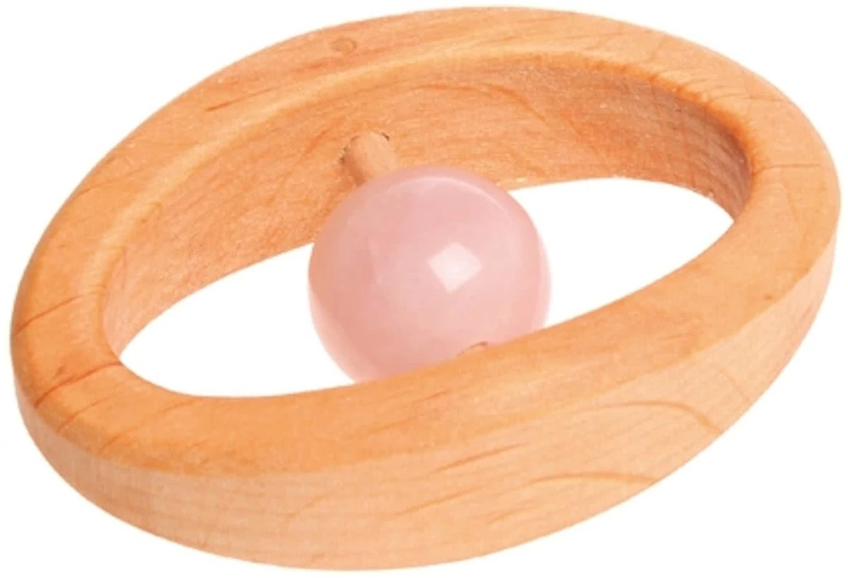 Rassel mit Rosenquarz-Perle. Diese Rassel spielt mit dem sinnlichen Kontrast zwischen warmem Holz und kaltem Halbedelstein.