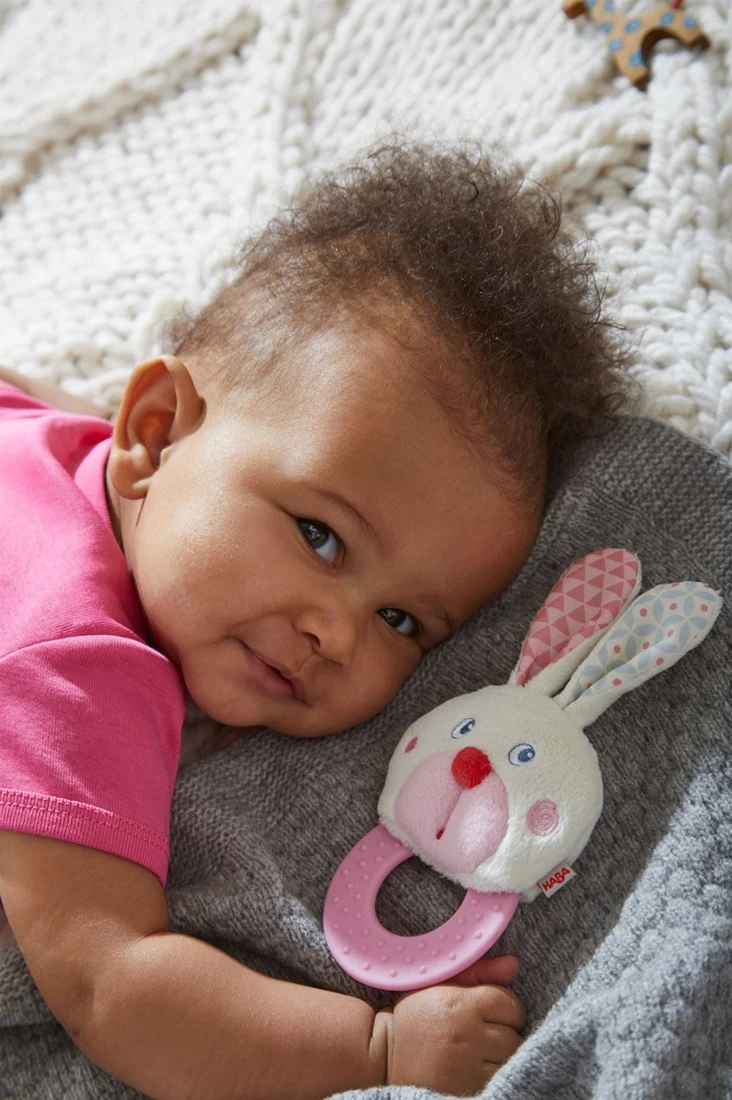 HABA Beißkerl Hase. Dieser niedliche Beißkerl bietet zahnenden Babys viel Spielspaß und Entspannung beim Herumkauen auf dem Kunststoffring mit Noppen und lädt sie zum Greifen und Spielen ein.
