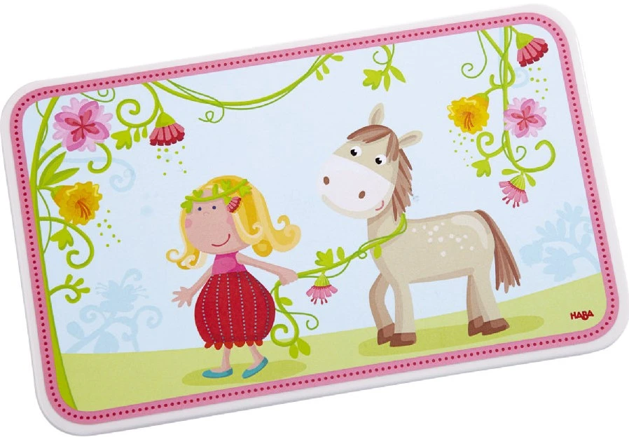 „Komm mit, wir gehen frühstücken, Pirli!“ Auch Vickis Freundin ist mit dem HABA-Brettchen Vicki & Pirli zum Schlemmen eingeladen. Angerichtet auf dem niedlichen Melamin-Brettchen schmecken Brothäppchen und Apfelschnitze gleich doppelt so lecker. Kleine Schleckermäulchen schätzen aber nicht nur das liebevolle Motiv dieses Kinder-Brettchens. Es kann dank der Gumminoppen an der Unterseite auch nicht so leicht verrutschen. Das ist besonders dann wichtig, wenn Kinder das Essen mit Messer und Gabel üben. Das HABA-Brettchen Vicki & Pirli aus robustem Melamin darf sogar in die Spülmaschine.
