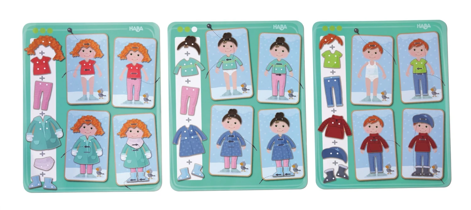 Kleid oder Mantel? Halbschuhe oder Stiefel? Was tragen die Mädchen und der Junge im Sommer oder im Winter? Das können die Kinder beim Fädeln nach Vorlagen oder im freien Spiel entscheiden, denn die 36 verschiedenen Frisur- und Kleidungsplättchen bieten unzählige kreative Fädelmöglichkeiten.