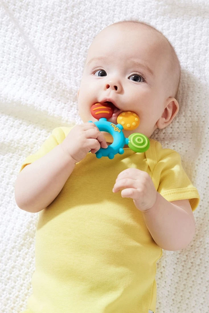 HABA Greifling Farbenspiel. Gerade in den ersten Monaten lieben Babys es, alles in den Mund zu stecken. Der süße Greifling ist hierfür perfekt, denn durch unterschiedliche Oberflächenstrukturen lädt er zur abwechslungsreichen Entdeckungstour ein. Vor allem beim Zahnen entspannt und beruhigt der Greifling die Babys und wird zum unverzichtbaren Helfer!