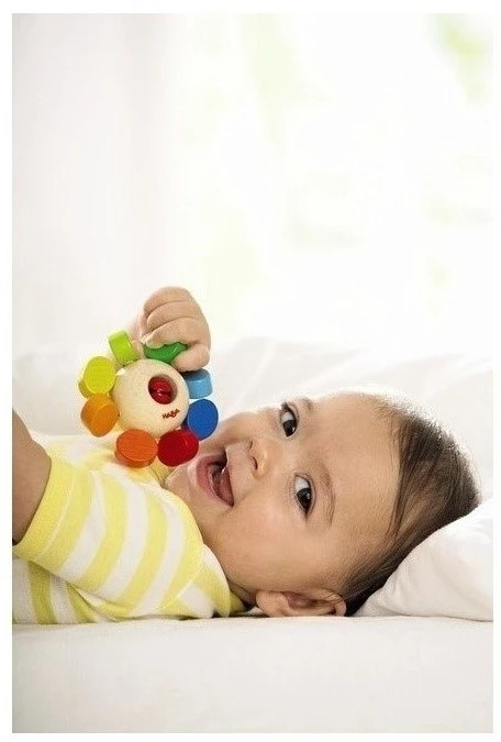 Mit beweglichen Farbelementen und Glöckchen. Holzteile auf Gummiband gefädelt.