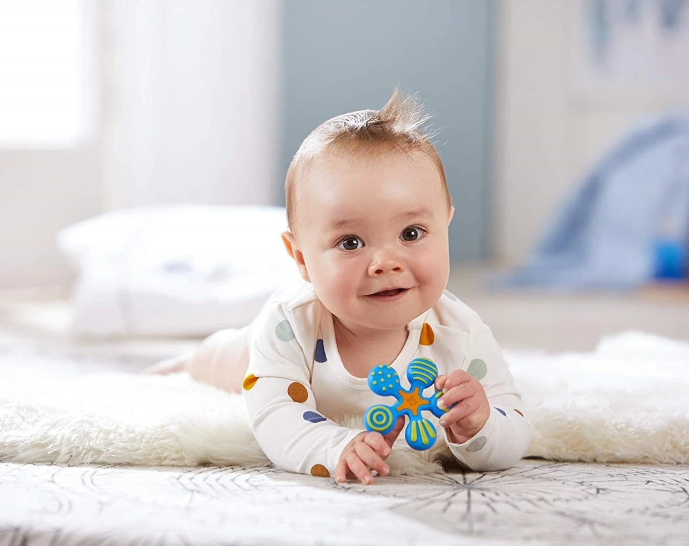 Babys lieben es, Dinge mit allen Sinnen zu erkunden. Dabei spielen gerade in den ersten Lebensmonaten der Geschmackssinn bzw. die Zunge und der Mundraum eine große Rolle. Eltern wissen: Ihre Babys stecken sich alles Mögliche in den Mund und kauen genüsslich darauf herum. Der putzige HABA-Greifling Stern aus Silikon lädt mit seinen fünf Armen zu einer spaßigen Entdeckungstour ein. Jeder Arm des Sterns besitzt eine anders strukturierte Oberfläche: Mal ist er mit vielen kleinen Punkten, mal mit dünnen oder breiten Streifen oder mit Kringeln überzogen. Das Kauen auf den unterschiedlichen Strukturen bietet somit viel Abwechslung. Es entspannt und beruhigt, vor allem beim Zahnen. Der HABA-Grefiling Stern ist für Babys daher ein äußerst nützlicher Helfer!