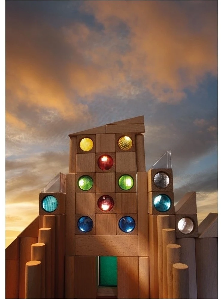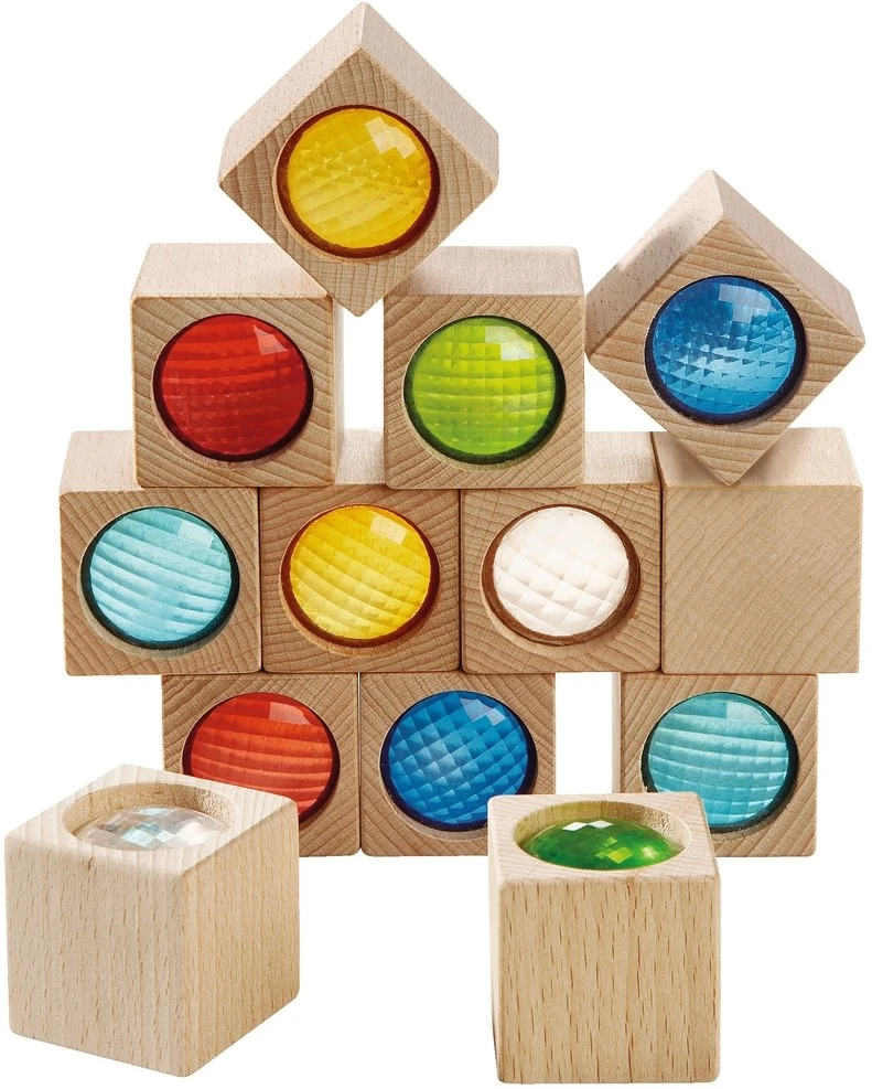 Die HABA-Kristallbausteine fallen sofort ins Auge. Schaut man durch die bunten Prismen, sieht man die Umgebung ähnlich wie durch ein Kaleidoskop in bunten Farben und Formen. Mit diesen faszinierenden Bausteinen macht es den Kindern besonders viel Freude zu bauen. Dabei trainieren sie spielerisch ihre Auge-Hand-Koordination und ihre Feinmotorik. Besonders intensiv wirken die Kristallbausteine in Kombination mit naturbelassenen, unlackierten Bausteinen von HABA. Die Kinder können mit ihren leuchtenden Farben in Gelb, Hell- und Dunkelblau, Rot und Grün ausgefallene Akzente setzen. Ob Häuser und Türme oder Schlösser und Burgen – so entstehen immer wieder einmalige Fantasiegebäude. Und strahlt man die Kristallbausteine im Dunkeln an, funkeln sie geheimnisvoll!