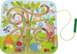 Wer hilft den kleinen Waldbewohnern im Magnetspiel Baumlabyrinth? Die weißen Kugeln sind Eier aus dem Vogelnest, die roten Kugeln Äpfelchen und die gelben Birnen. Mit dem Magnetstab können kleine Gartenfreunde diese Kugeln ganz nach Lust und Laune verschieben oder auch farblich sortieren. Aber Vorsicht! Wenn die Kugeln des Magnetspiels zu schnell bewegt werden, verlieren sie den Kontakt zum Magneten und fallen ganz schnell wieder nach unten. Und natürlich muss man im Magnetspiel Baumlabyrinth aufpassen, dass man nicht falsch abbiegt. Das macht Spaß und fördert spielerisch die Feinmotorik und die Konzentration