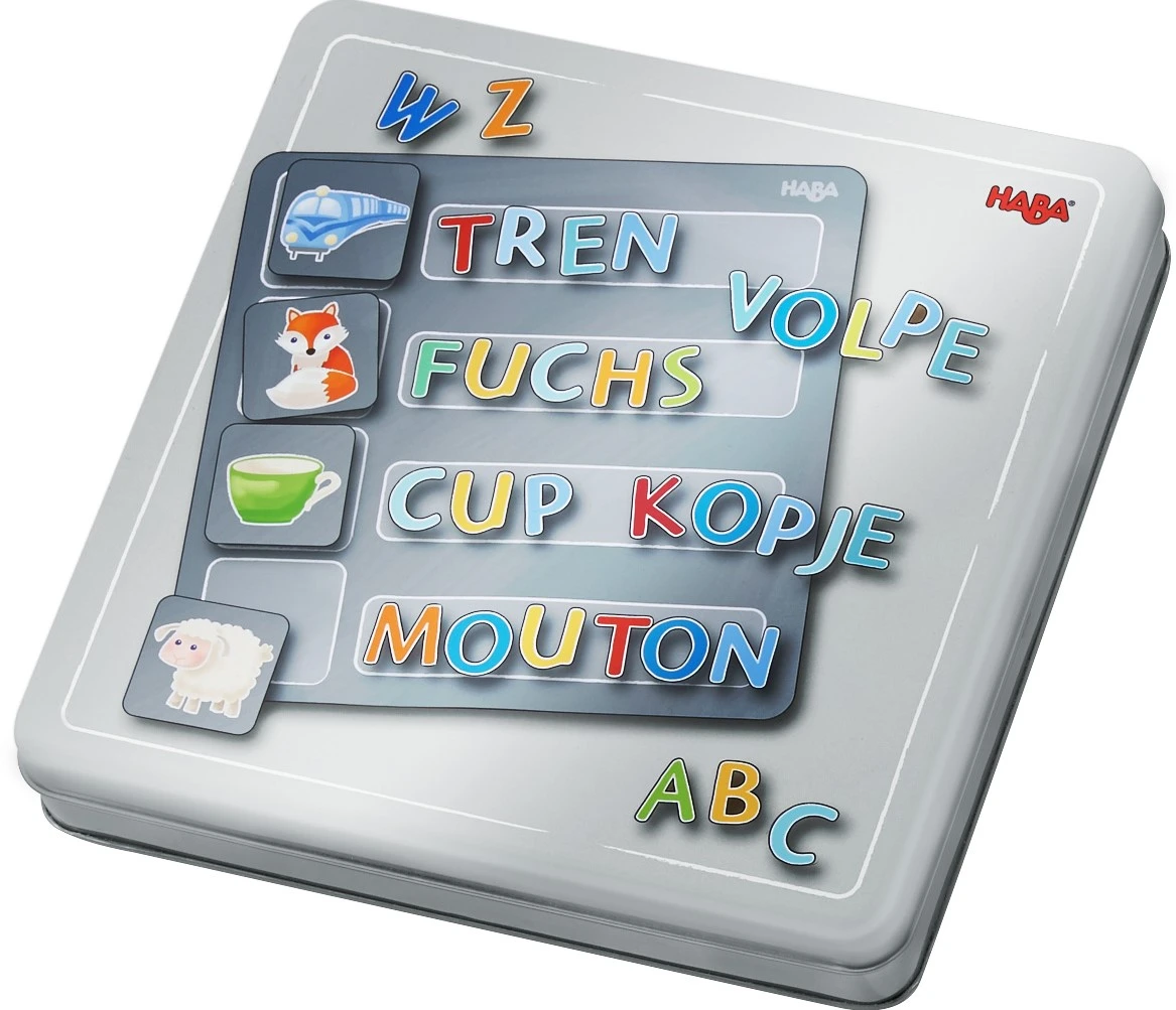 HABA Magnetspiel-Box Buchstaben. Willkommen im Land der Buchstaben! Dieses fröhlich-bunte Buchstaben-Magnetspiel mit vielen Motiven lädt Kinder zum spielerischen Kennenlernen des Alphabets und Schreiben erster Wörter ein. Die praktische Metalldose ist dabei Spielfläche und Aufbewahrungsbox in einem. So kann auch auf Reisen nichts verloren gehen.