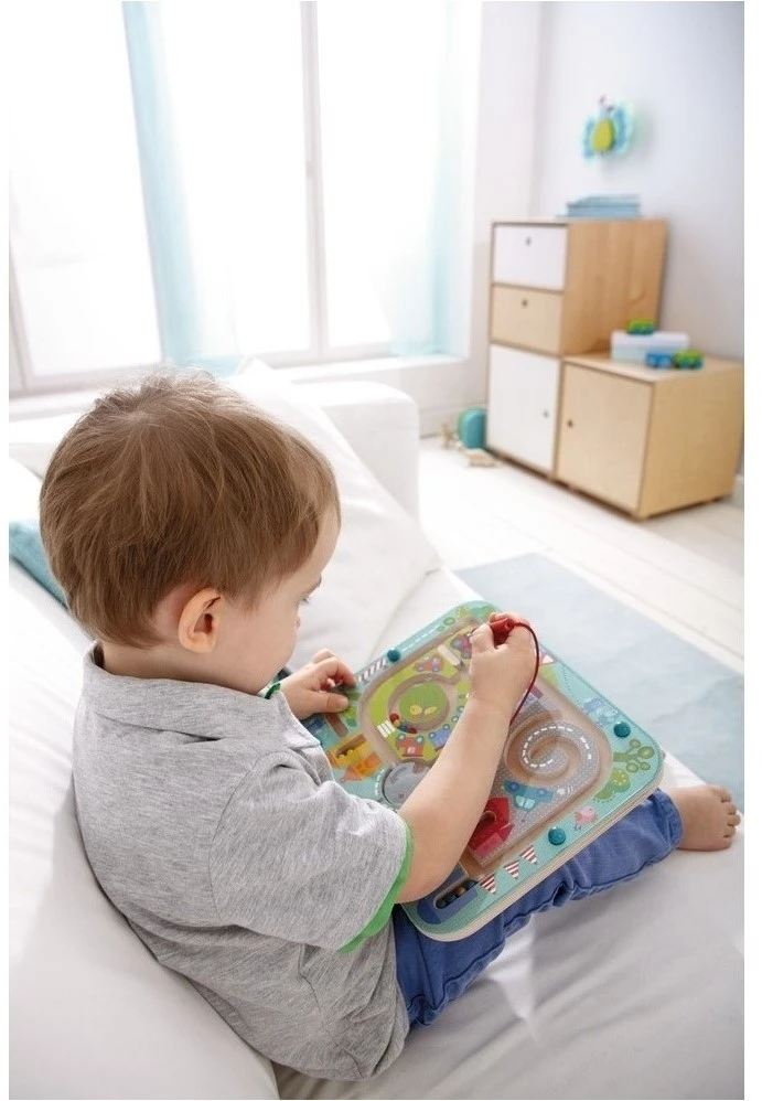 Beim Magnetspiel Stadtlabyrinth von HABA sind kleine Verkehrspolizisten gefragt: Die farbigen Kugeln sollen mit dem Magnetstab durch die Stadt auf die farblich passenden Parkplätze bewegt werden. Dabei ist in der Stadt ganz schön viel los. Wer darf zuerst durch den Kreisverkehr? Mit der Drehscheibe lässt sich das einfach regeln und mit dem Schiebestein eine Straße sperren. Wo kann man abbiegen und wie geht der Weg weiter? Aber Achtung! In der Stadt dürfen die Kugeln nicht zu schnell „fahren“, sonst geht der Kontakt zum Magnetstift verloren und man muss von vorne beginnen. So wird spielerisch Konzentration und Feinmotorik trainiert.