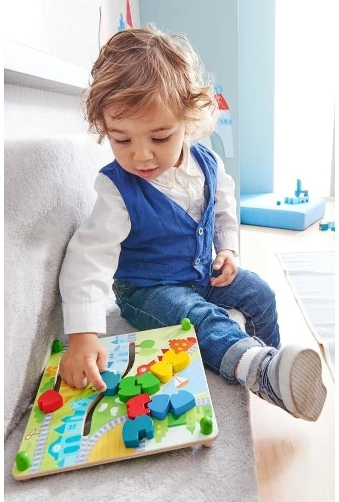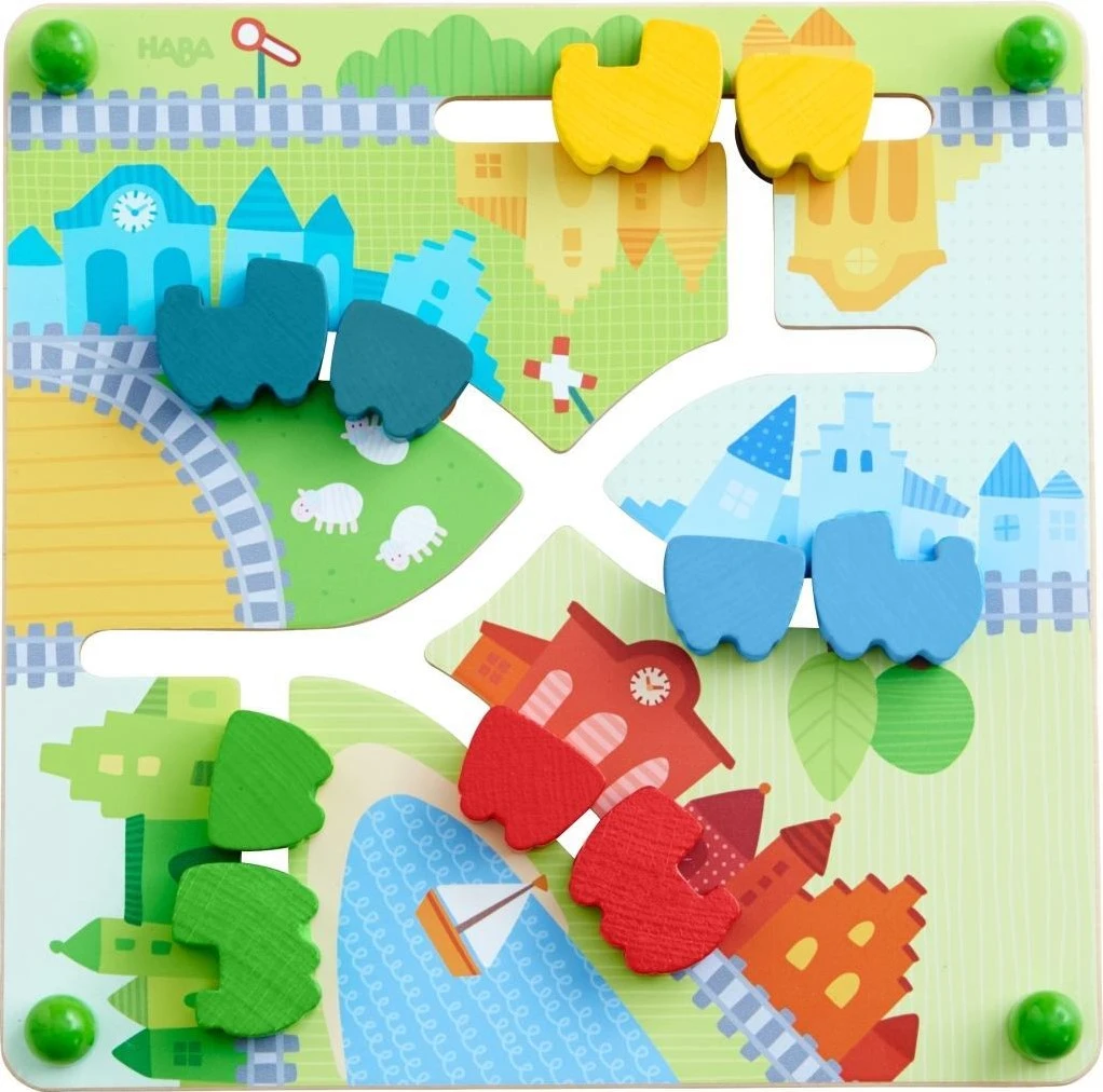 Tut, tut, hier kommt der bunte Farbenzug! Doch wo fährt er hin? Hier können Kinder die Loks und Waggons nach Lust und Laune hin und her schieben oder den farblich passenden Gebäuden zuordnen. Drehen sie das Schiebebrett um, lernen sie spielerisch die verschiedenen Farben kennen.