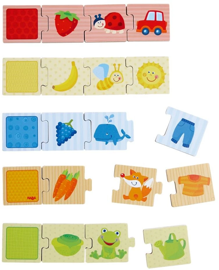 Der Frosch gießt mit seiner grünen Gießkanne den Salat? Oder doch die rote Erdbeere? Mit dem lustigen Zuordnungsspiel Alle meine Farben von HABA tauchen Kinder in die bunte Welt der Farben ein. Die 20 Plättchen aus Holz sind mit unterschiedlichen Farben und Motiven bedruckt: Das Startplättchen zeigt jeweils ein Quadrat in Rot, Gelb, Orange, Grün oder Blau, die weiteren Puzzleteile lustige Motive von typischen Gegenständen oder Tieren in dieser Farbe. Während die Kinder die Plättchen mit den Motiven in gleichfarbige Reihen puzzeln, schulen sie ihre Feinmotorik und sie lernen außerdem noch die Farben und die Namen der Tiere und Gegenstände kennen. Denn die gelbe Biene sucht schließlich keine blaue Jeans und keine rote Erdbeere, sondern …? Aber natürlich kann man alle Puzzleteile aus Holz auch kunterbunt aneinander legen.