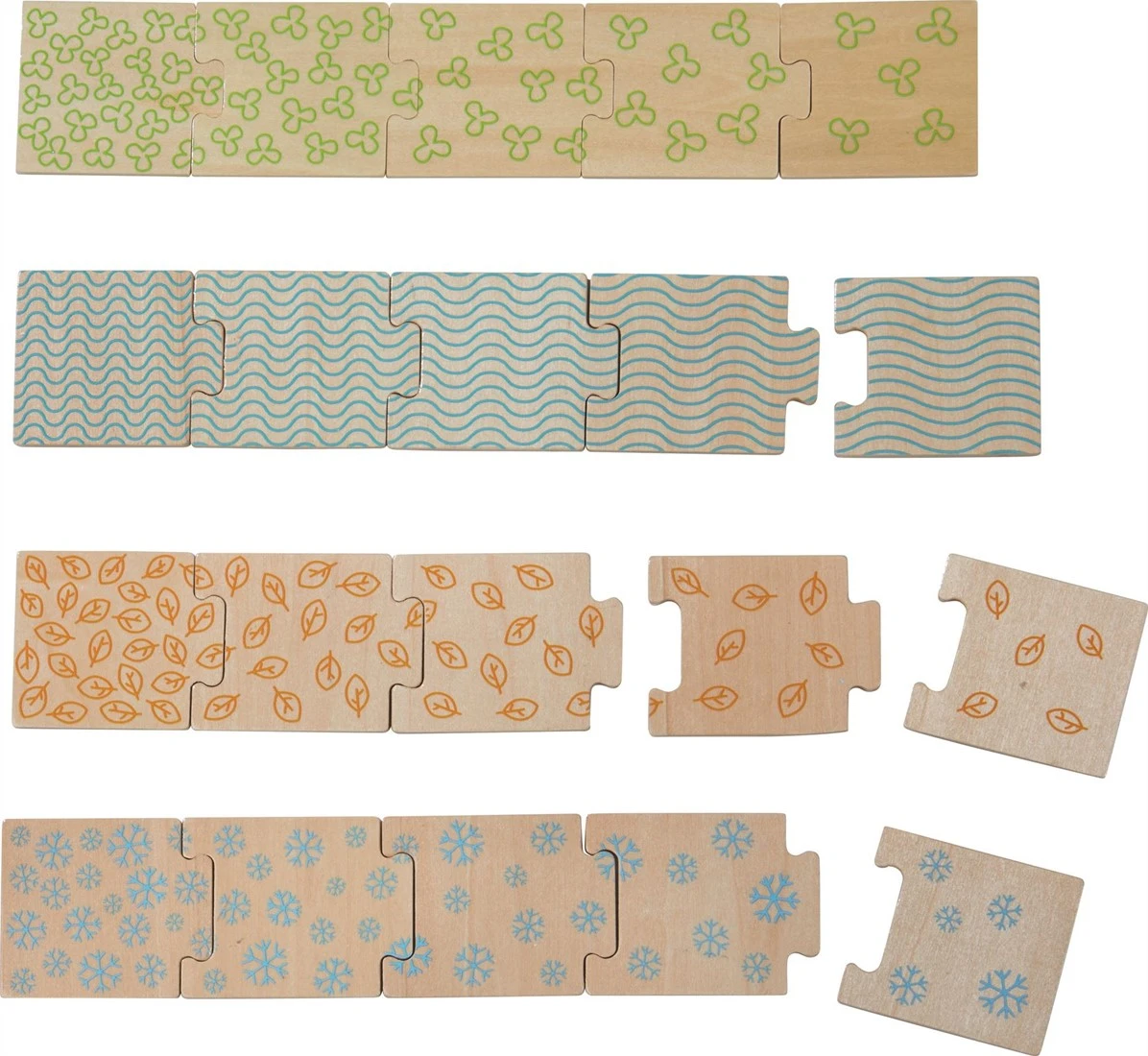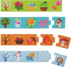 HABA Zuordnungsspiel Jahreszeiten. Welche Blumen blühen im Frühjahr oder Sommer? Welche Früchte kann man im Herbst ernten und was kann man im Winter draußen machen? Hier ordnen die Kinder jedem der 4 Baumplättchen die passenden Motivplättchen zu. So lernen sie spielerisch die verschiedenen Jahreszeiten kennen.