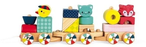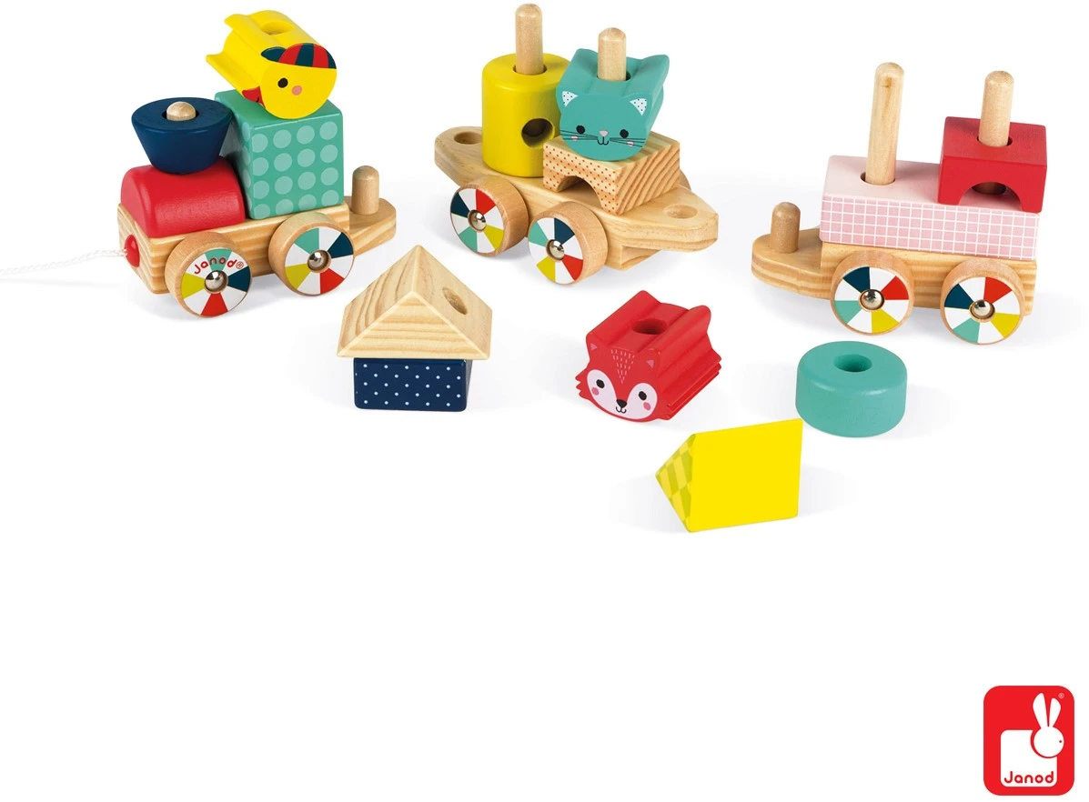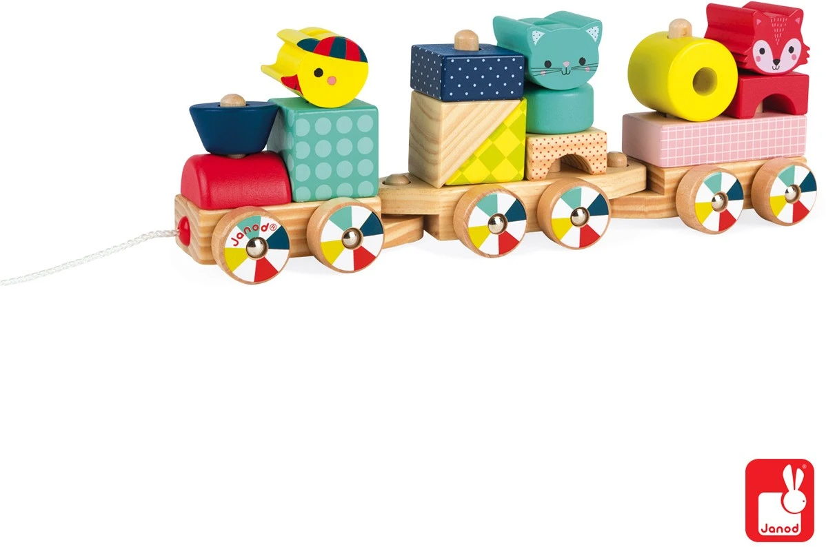 Janod – Baby Forest Holzzug, Nachziehspielzeug, mit 17 Bausteinen, zum Erlernen von Formen und Farben, fördert feinmotorische Fähigkeiten, ab 1 Jahr, J08022