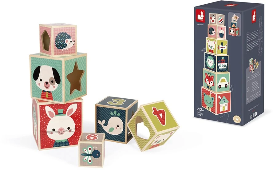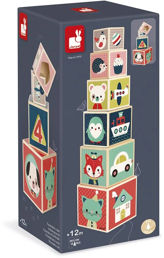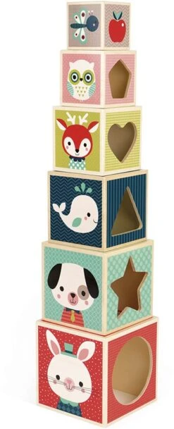 Holzspielzeug. Stapelpyramide aus Holz. 6 Elemente. Dieser Baukasten mit 6 schachtelbaren Würfeln aus Holz fördert die Entwicklung der Koordination und der Beobachtungsgabe des Kindes. Jede Würfelseite zeigt ein anderes Motiv: Tiere, Zahlen, Formen, Objekte €¦ Jeder Würfel besitzt eine Seite ausgestanztem Motiv mit einer erkennbaren Form (Herz, Stern, Dreieck €¦), die das Tier des drinnen liegende Würfels zum Vorschein bringt.