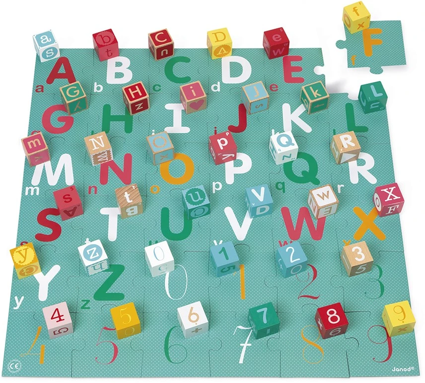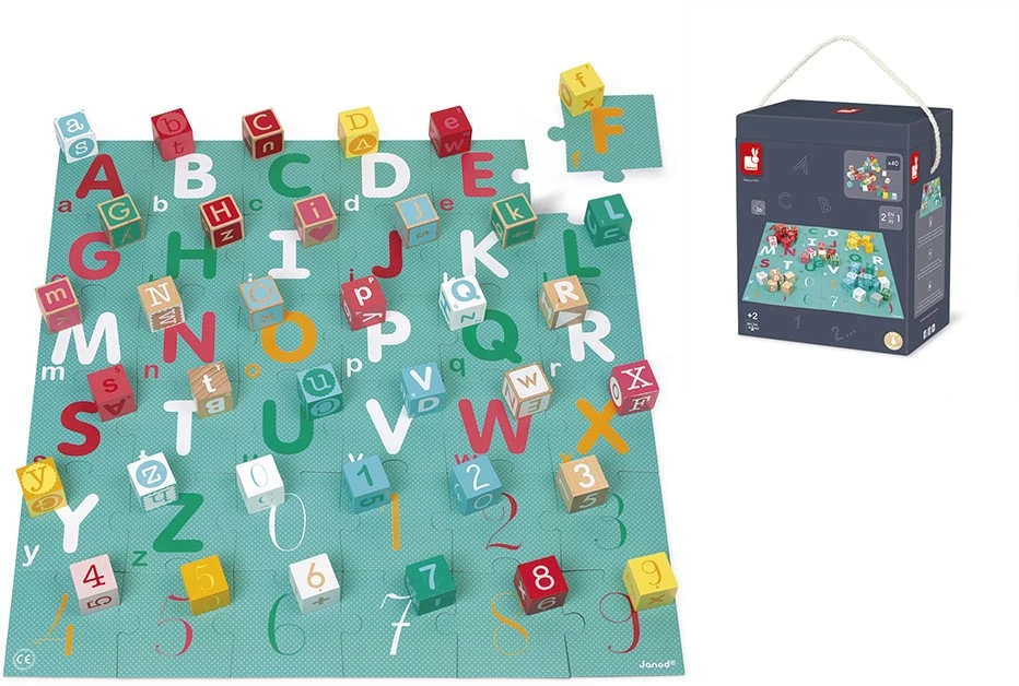 Janod Janod-Kubix-40 36-teiliges Buchstaben und Zahlen-Baustein-Spiel aus Massivholz + Puzzle-Spielmatte-praktische Aufbewahrung-Wasserfarben-ab 2 Jahren, J08307