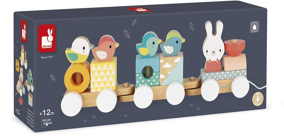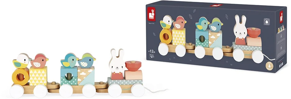 Eine hübsche 2-in-1-Eisenbahn in zarten und hochaktuellen Farbtönen mit niedlichen Tieren: Eine Eisenbahn aus Holz mit drei Wagen zur Entwicklung der Fantasie Ihres Kindes und ein Ziehspielzeug, das seine Motorik fördert. Die Eisenbahn setzt sich aus 17 bunten Klötzchen in verschiedenen geometrischen Formen zusammen, mit deren Hilfe Baby die Farben lernen und seine ersten Bauwerke erschaffen kann.