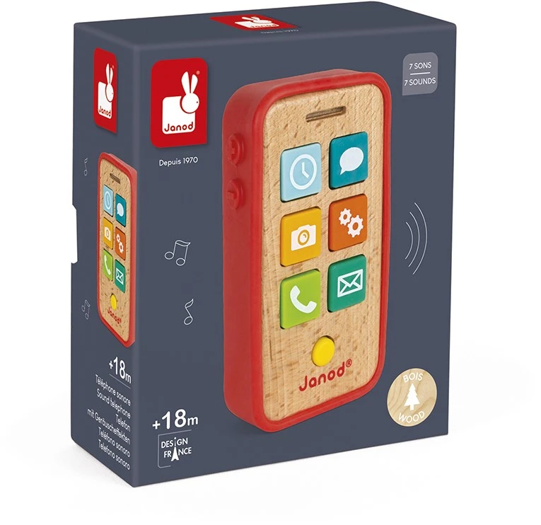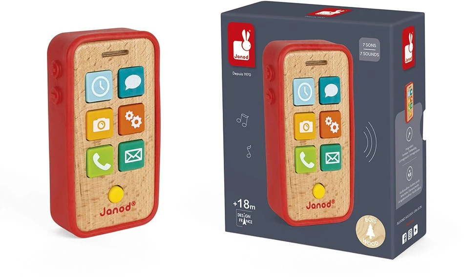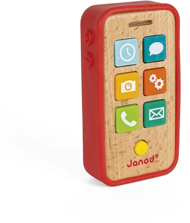 Holzspielzeug. Spielzeug aus massivem Holz. Realitätsgetreues Smartphone mit vielen Funktionen, mit Batterie, in einer weichen Hülle aus Silikon. Mit Soundeffekten wie ein echtes Smartphone: 7 unterschiedliche Töne: Home-Button, email, Alarm, Klingeln, Kamera, SMS und Einstellungen. Hülle aus Silikon. Batterie enthalten (3x LR44 1.5). Buchenholz