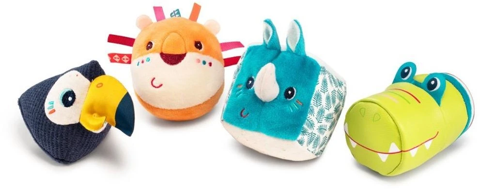 Diese „Rasselbande“ aus weichen, farbenfreudigen Dschungeltieren ist variantenreich: Jede der vier Rasseln hat eine andere geometrische Form und bietet eine Vielzahl von Themen und Aktivitäten.