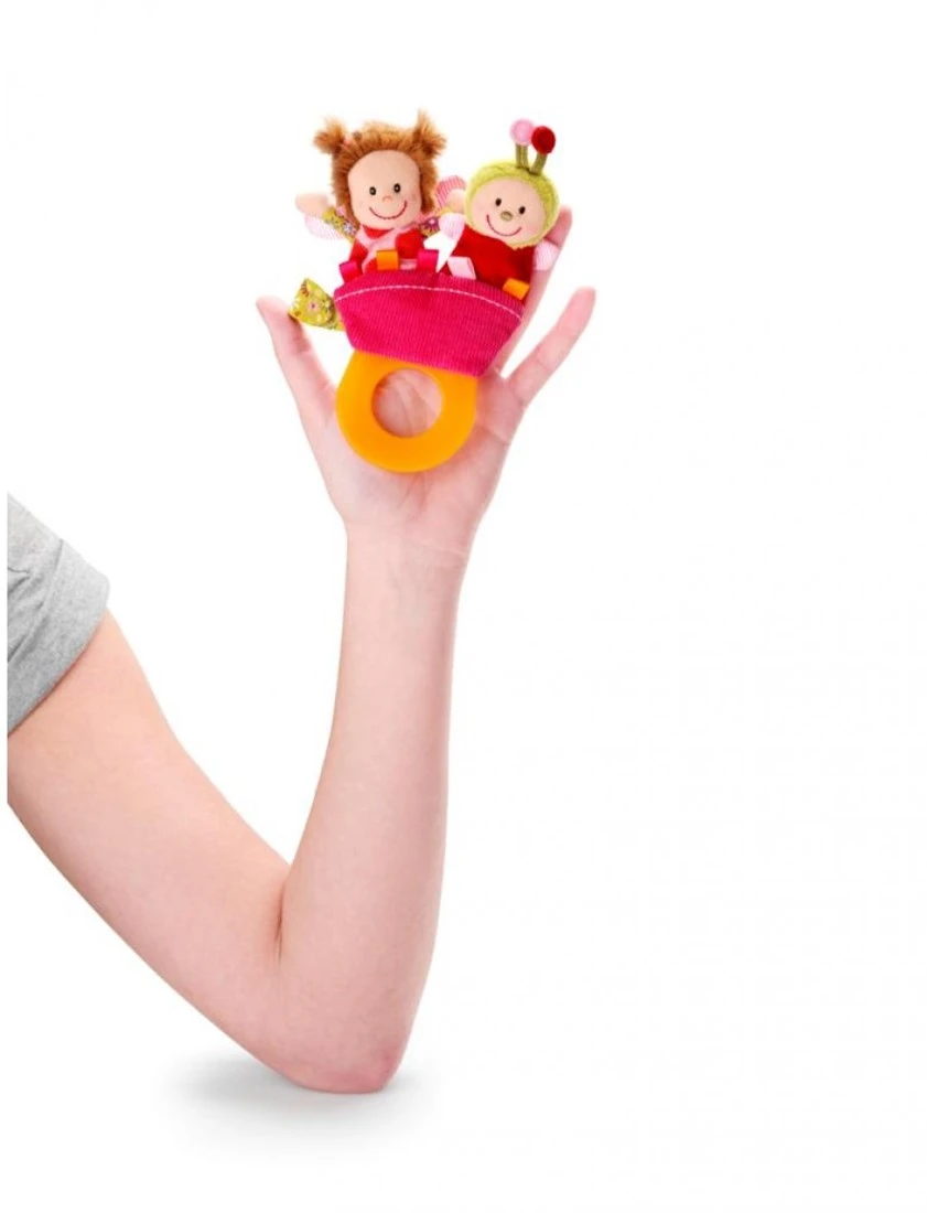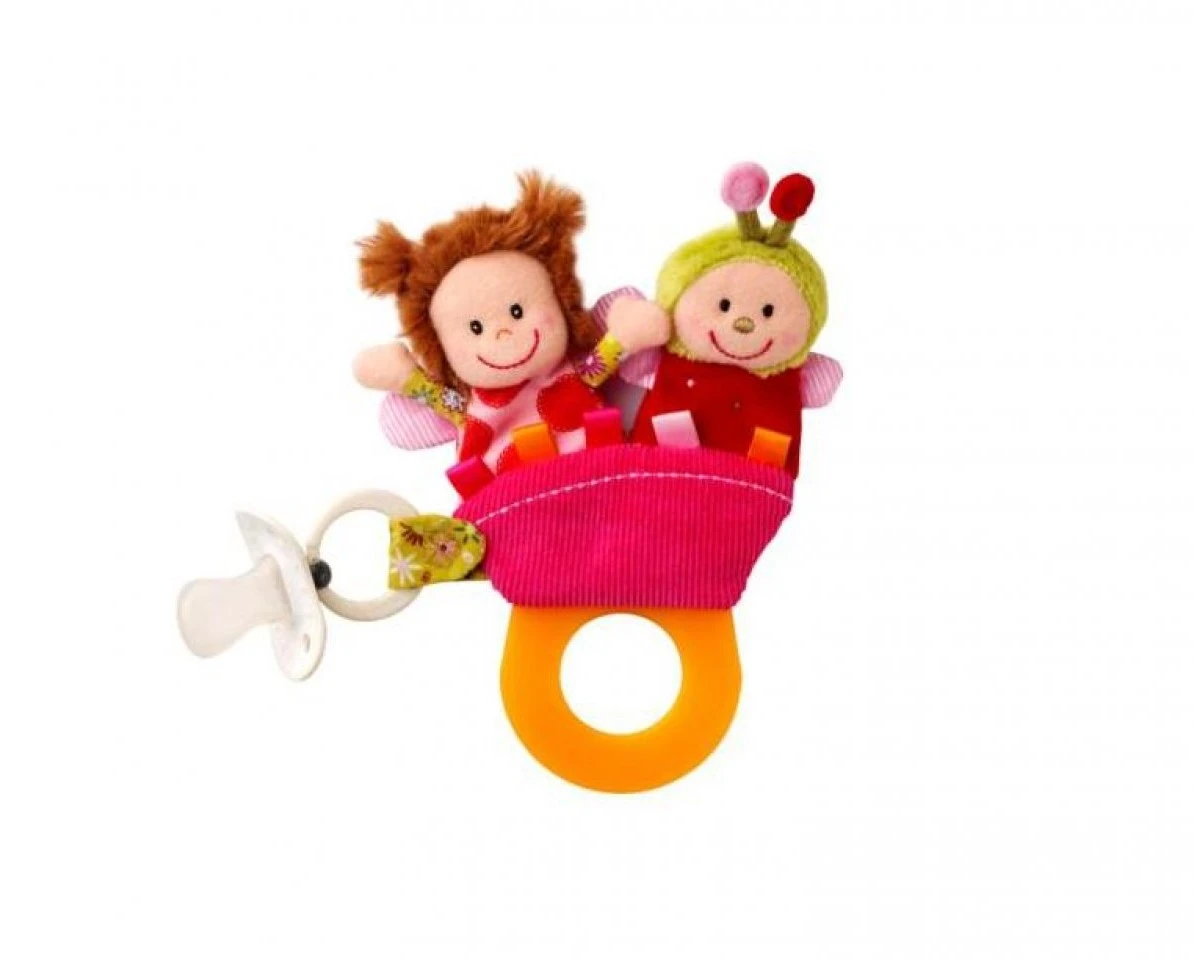 Die Fingerpuppe Liz und der Marienkäfer sitzen glücklich und zufrieden auf ihrem Beißring. Der Schnuller des stolzen Eigentümers lässt sich leicht am Blumenband befestigen.