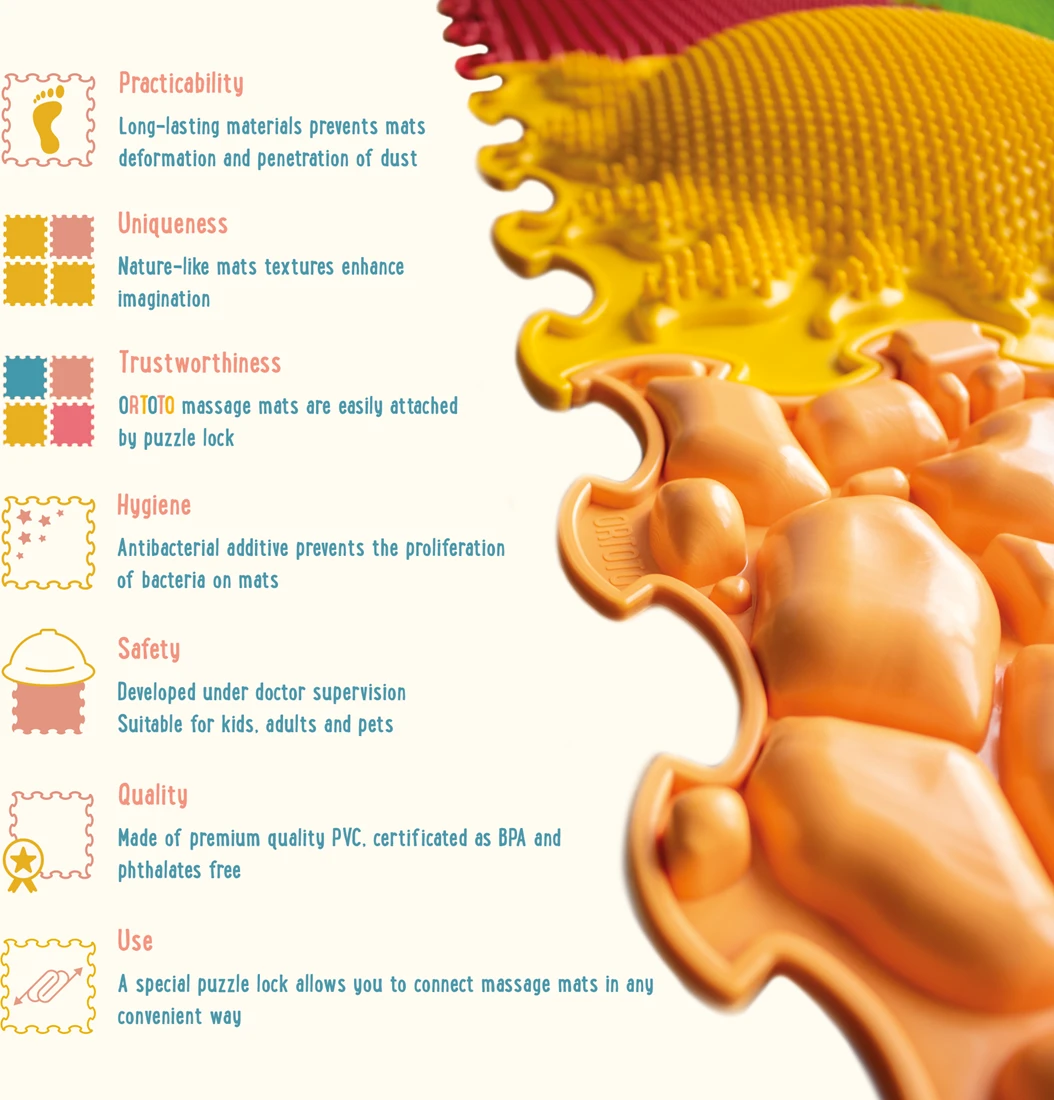 Geniet het hele jaar door van uw massageweekenden met de ORTOTO massagematenset „First Steps“! De massagematten zijn gemaakt van eersteklas PVC (polyvinylchloride), BPA en ftalaatvrij: