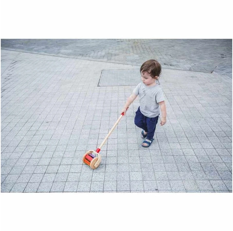 Wenn sich das Rad dreht, schlagen die Holzkugeln im Inneren auf die Platten und erzeugen lustige Geräusche. Empfohlenes Alter: Ab 12 Monaten.