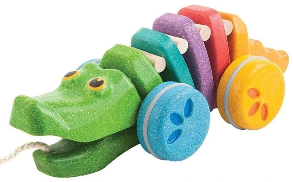 Dieser bunte Alligator ist aus PlanWood gefertigt. Wenn Kinder am Alligator ziehen, bewegen sich sein Kopf und Schwanz auf und ab – und machen ein lustiges Klick-Klack-Geräusch. Empfohlenes Alter: Ab 12 Monaten.