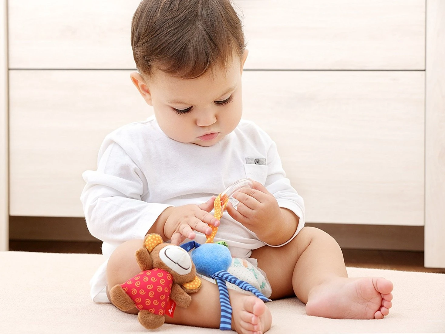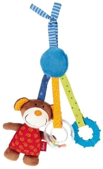 Eins, zwei, drei – ich hab alles dabei: mein weiches Schmusebärchen mit Quietsche, den kleinen Rasselgreifling und den Beißring. Der wunderschöne Anhänger zum Spielen und Entdecken hält die Kleinsten unterwegs bei Laune.