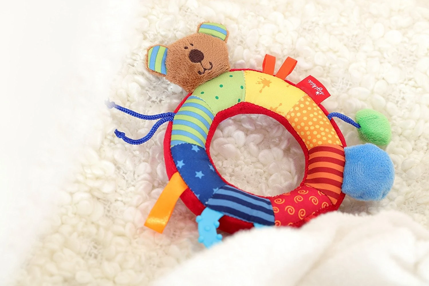 Komm doch mal her du süßer Bär und lass mal sehen, was ich schon kann verstehen: deine Rassel die klingt toll; deine Farben, Muster leuchten wundervoll; ein Beißring hilft mir beim Zahnen, die Knisterfolie kann ich erahnen.