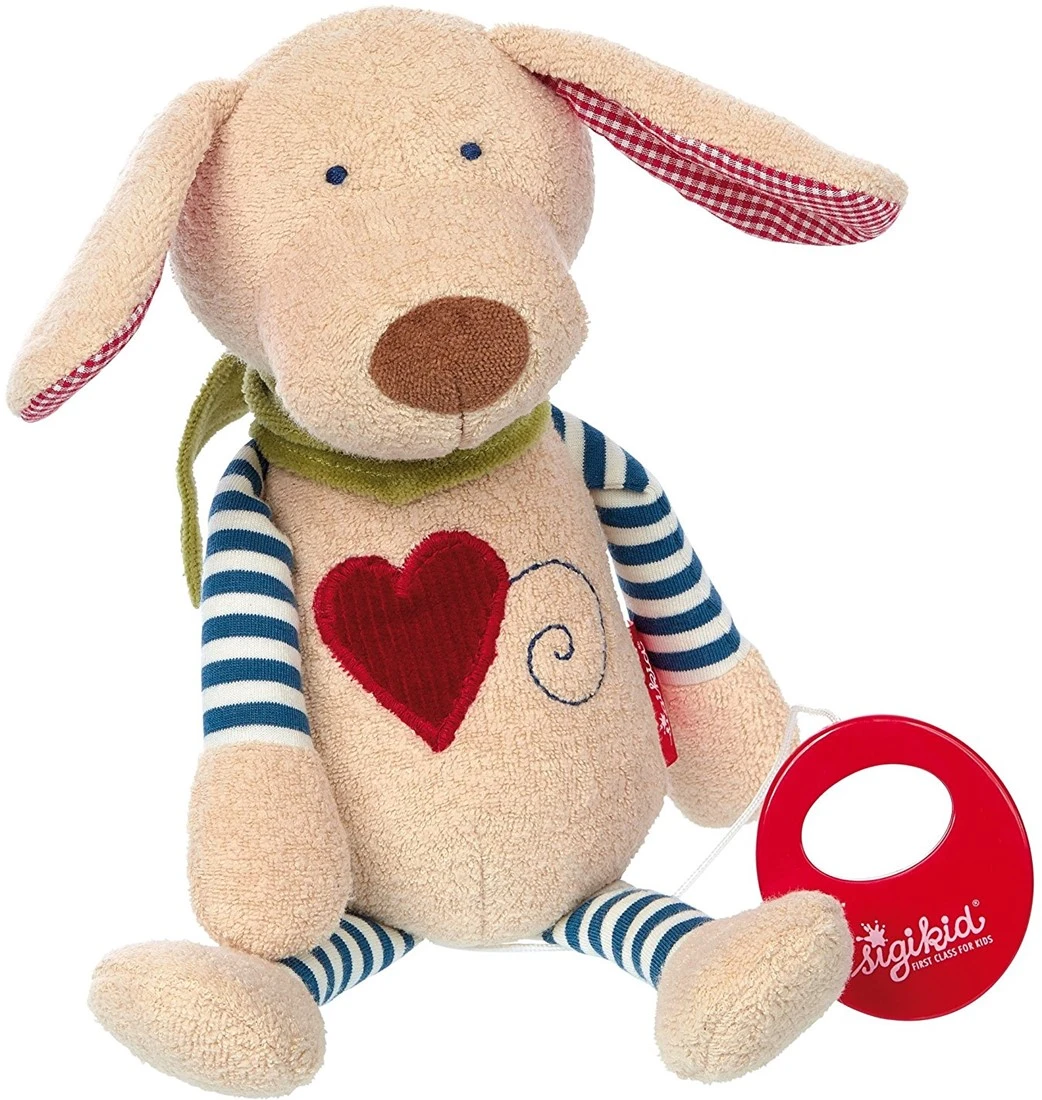 Kuschel mich und ich spiel Dir ein Leid. Der süße Musikhund bereichert Babys Alltag und ist auch nachts ein gern gesehener Schmusefreund im Bettchen. Tolle Plus: Die verwendeten Materialien sind aus 100% kbA-Baumwolle. Inkl. Spielwerk, dass zum Waschen oder zum Einsetzen einer neuen Melodie entnommen werden kann.