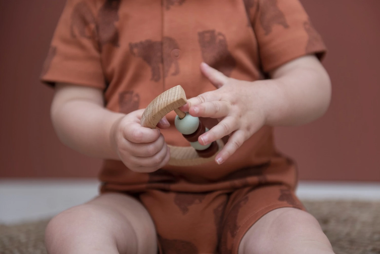 Kleine Hände können diese Rassel perfekt greifen und schütteln, um das fröhliche Rasselgeräusch zu entdecken. Die Perlen laden zum Tasten und Spielen ein.