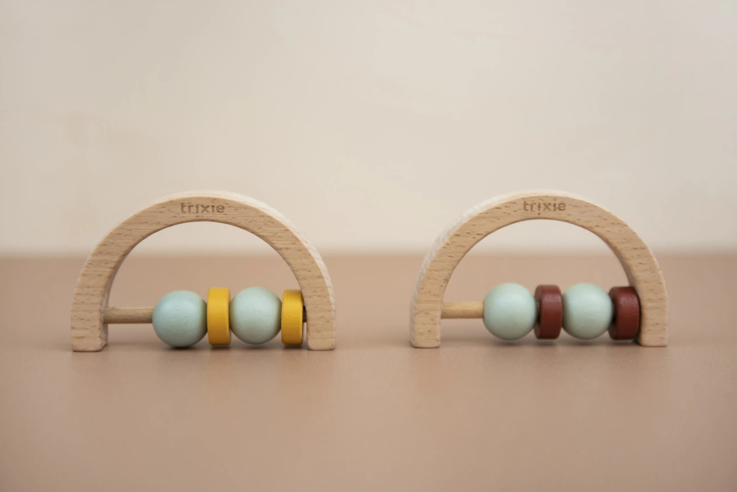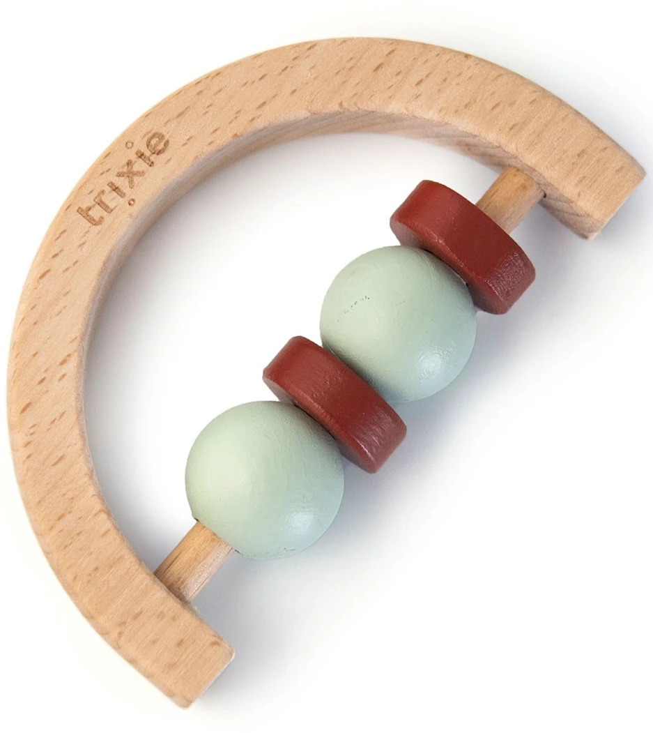 Die halbrunde Rassel ist aus hochwertigem und 100 % FSC®-zertifiziertem Buchenholz hergestellt. Sämtliche verwendeten Farben sind auf Wasserbasis.