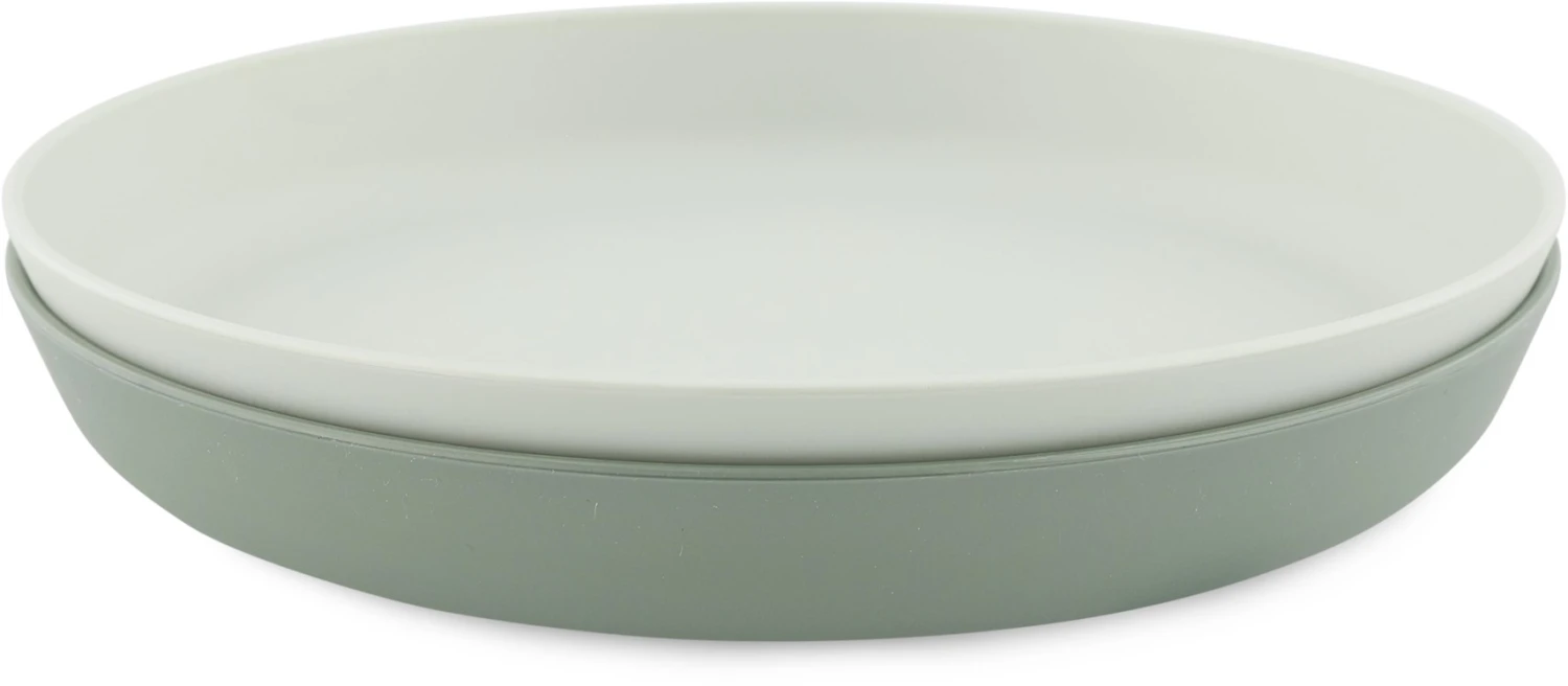 Mit diesen beiden Tellern aus pflanzlichem Kunststoff lässt sich ein gemütliches Ambiente am Tisch schaffen. Das Set besteht aus zwei verschiedenen Farben, die gut zueinander passen. Der Teller hat einen hohen Rand, um das Auslöffeln für Kinder zu erleichtern, die lernen, selbständig zu essen.