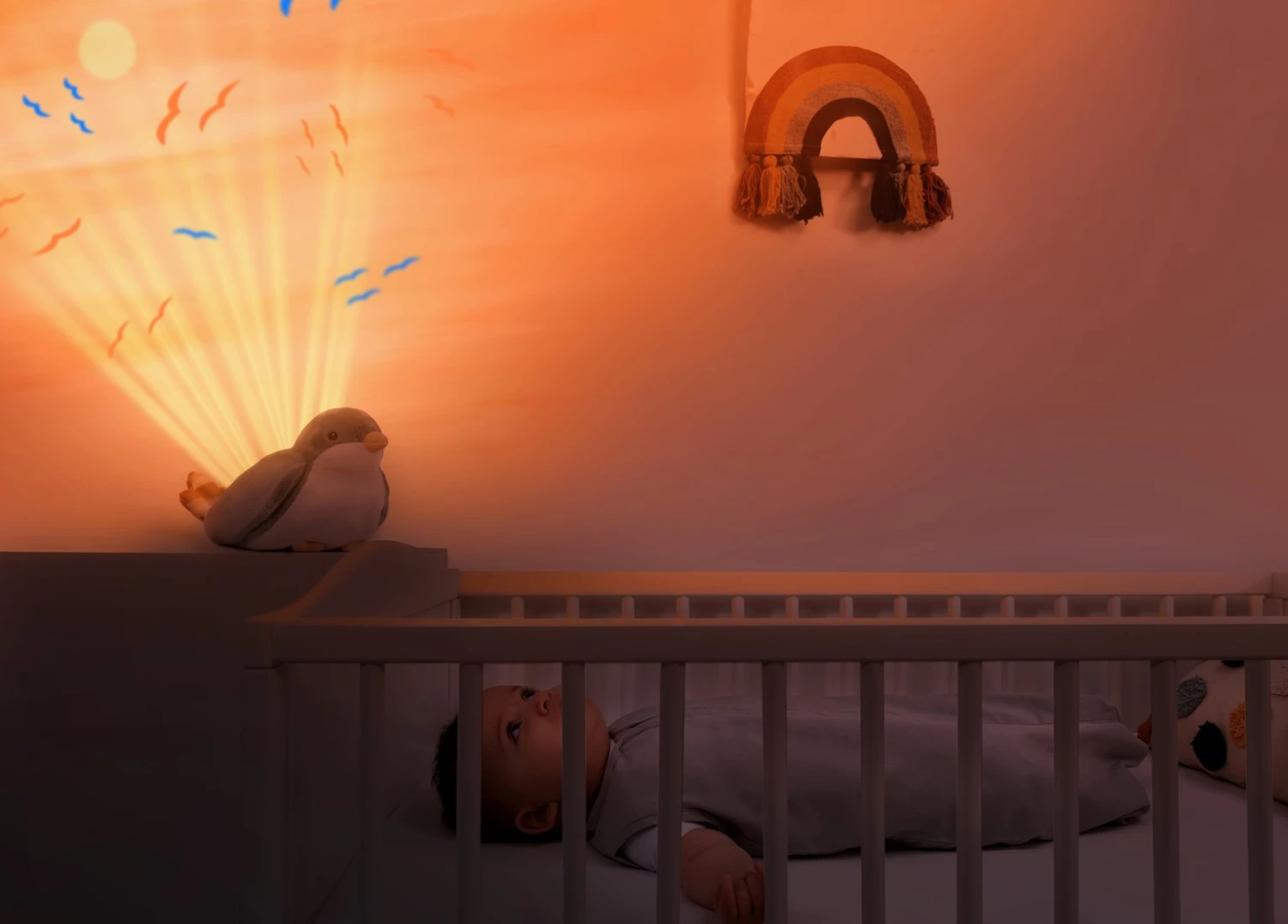De projector projecteert een magische zonsondergang met vogels die vliegen door de hele kamer. Het zachte oranje licht helpt bij de aanmaak van melatonine, het slaaphormoon.